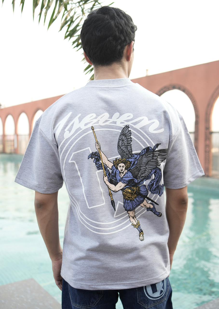 Introducing the ANGEL WARRIOR TSHIRT, a high-quality grey melange tshirt made from 260 gsm fabric. Featuring a vibrant warrior design, this shirt is sure to make a statement. Our logo adds a touch of branding to this unique apparel piece. Show off your inner strength and style with the ANGEL WARRIOR TSHIRT.