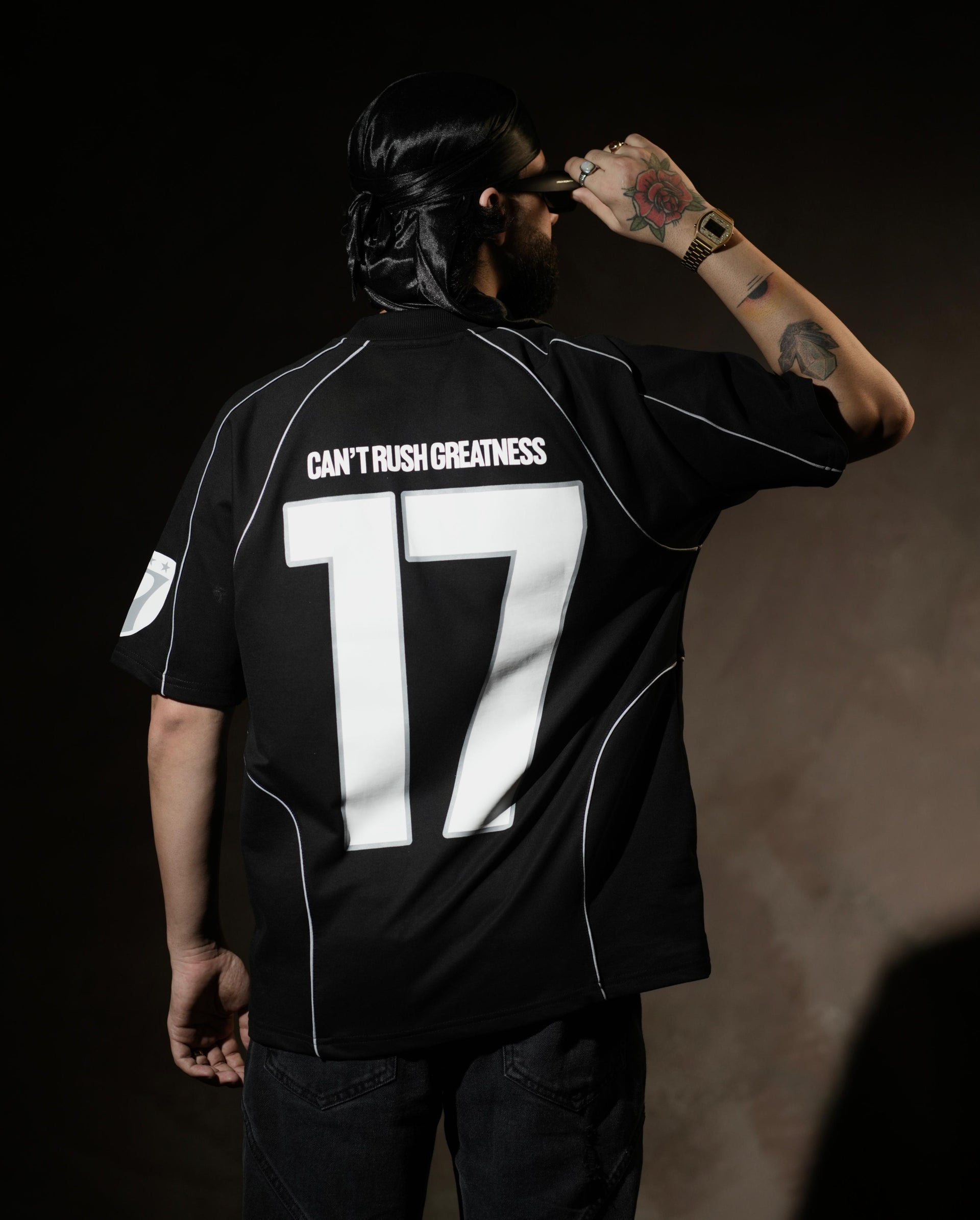 This black jersey t-shirt features subtle grey piping and is crafted from heavy 260 GSM looperknit cotton, ensuring durability and a premium feel. The fabric offers excellent comfort and structure, making it ideal for everyday wear. Highlighted by the motivational quote "Can't Rush Greatness," this tee combines style with inspiration, perfect for those who value quality and mindset in their wardrobe.